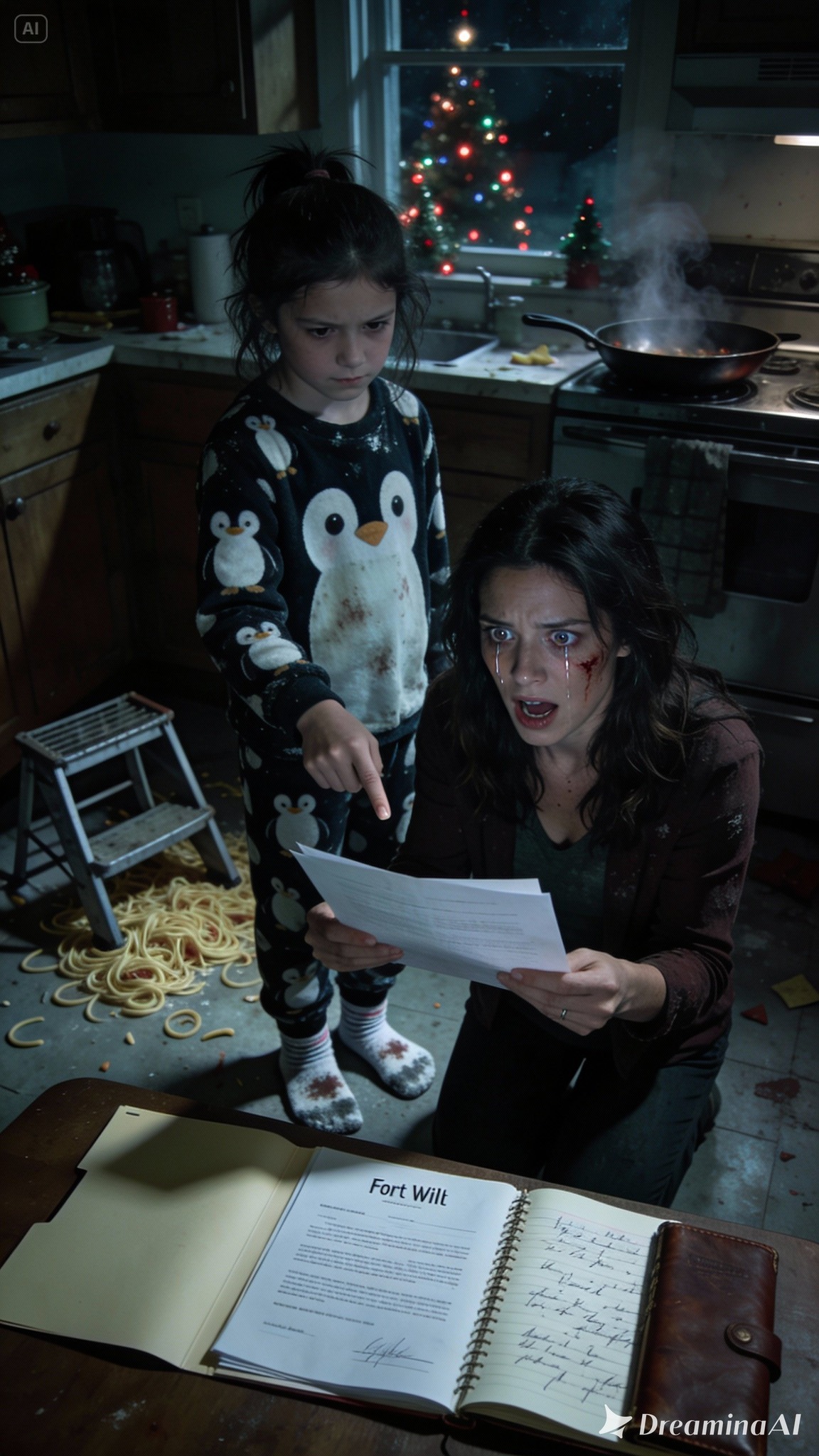 Emma stood at the massive gas range, balancing precariously on a step stool, trying to flip something in a skillet. Her dark hair—my hair—was pulled back in a messy, lopsided ponytail. She wore pajamas patterned with penguins and oversized fuzzy socks. The kitchen was a disaster zone: flour dusted the granite counters like snow, an open box of pasta lay on its side, and a pot of water was boiling aggressively, threatening to spill over.